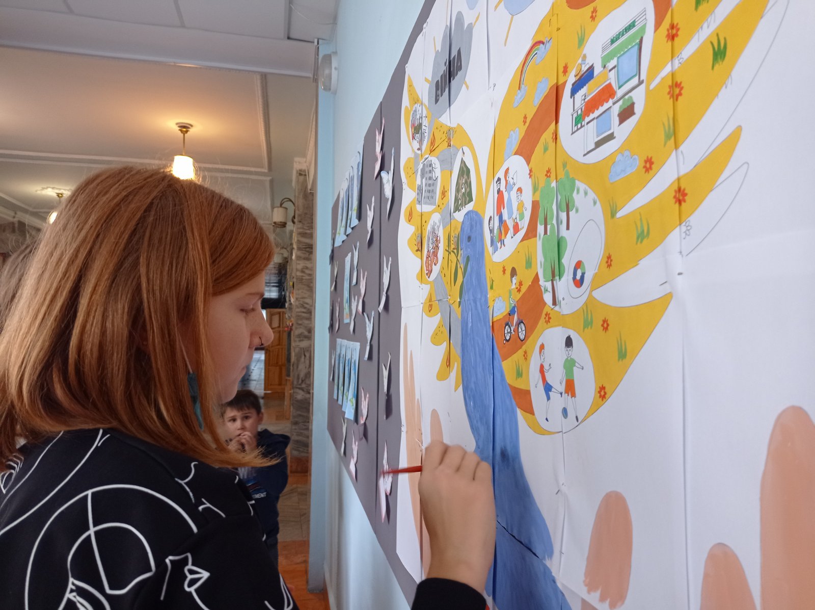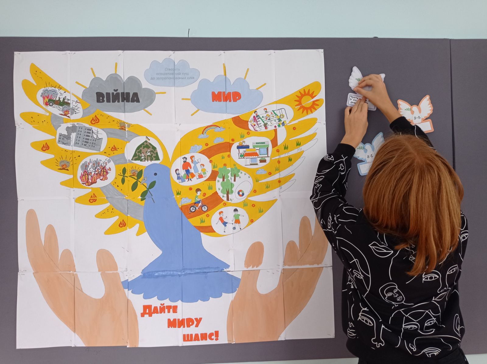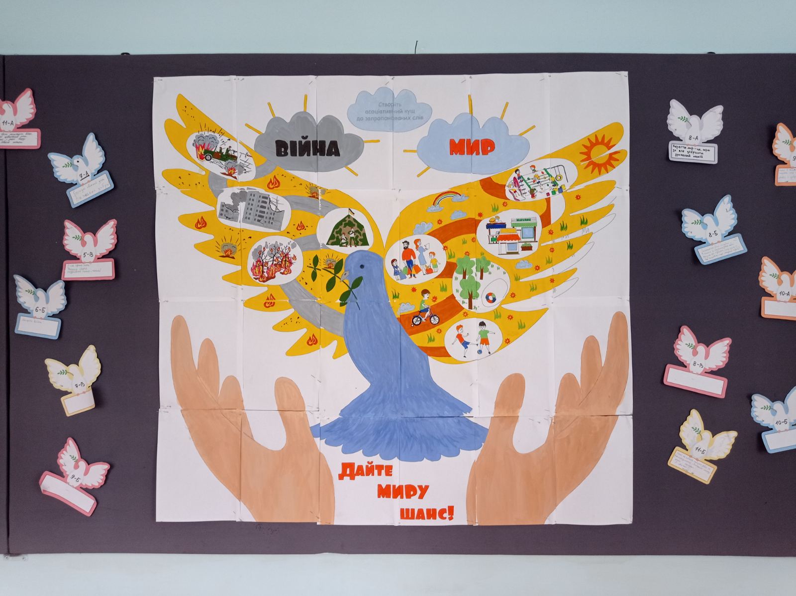 Діти власноруч намалювали плакат із зображенням голуба як символу миру та духовного розвитку нації.