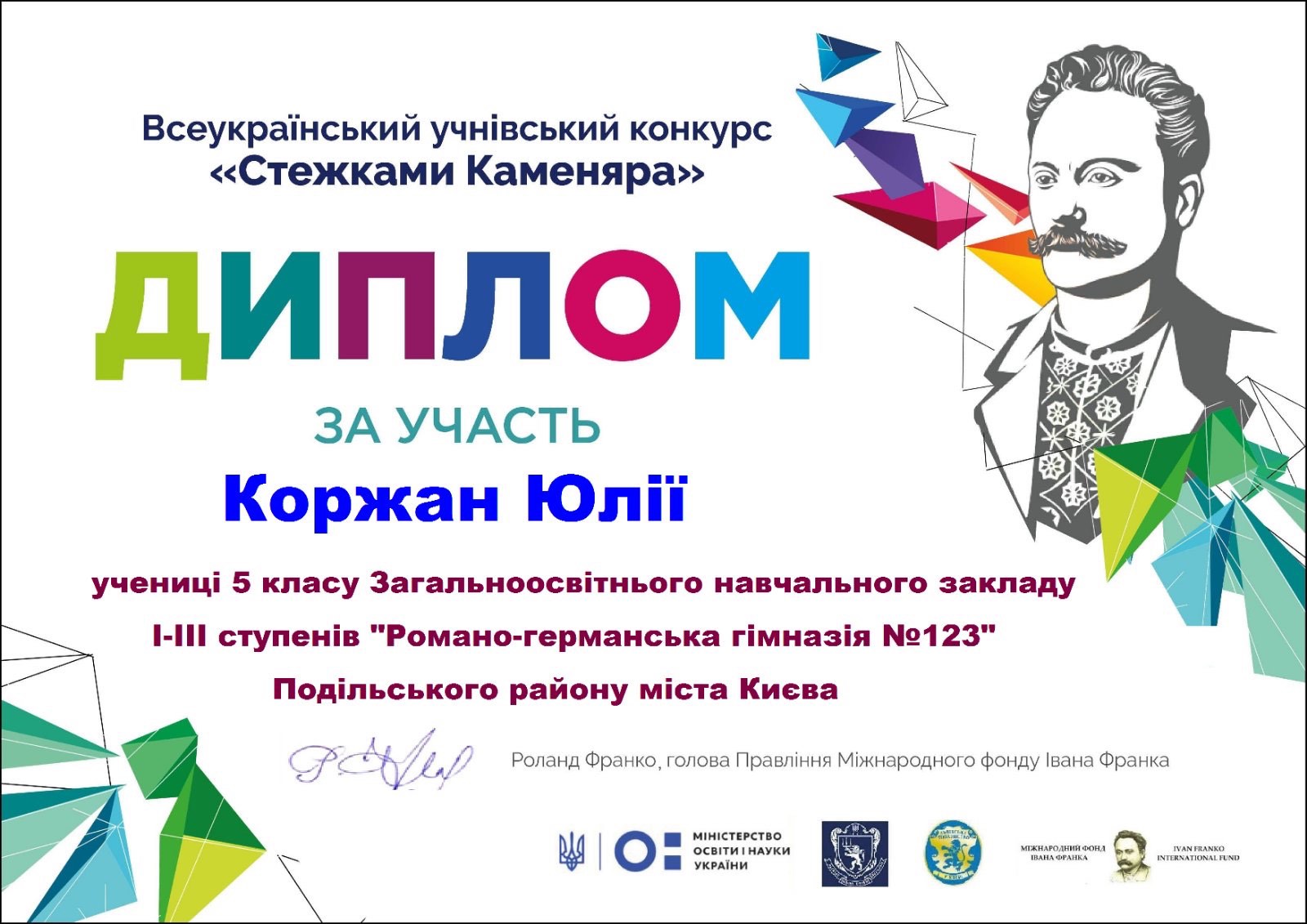 У конкурсі взяла участь учениця 5-Б класу Коржан Юлія з ілюстрацією до поезії Івана Франка «У долині село лежить». І хоча призового місця Юлія не посіла, але гідно представила гімназію на конкурсі та стала його лауреатом!
