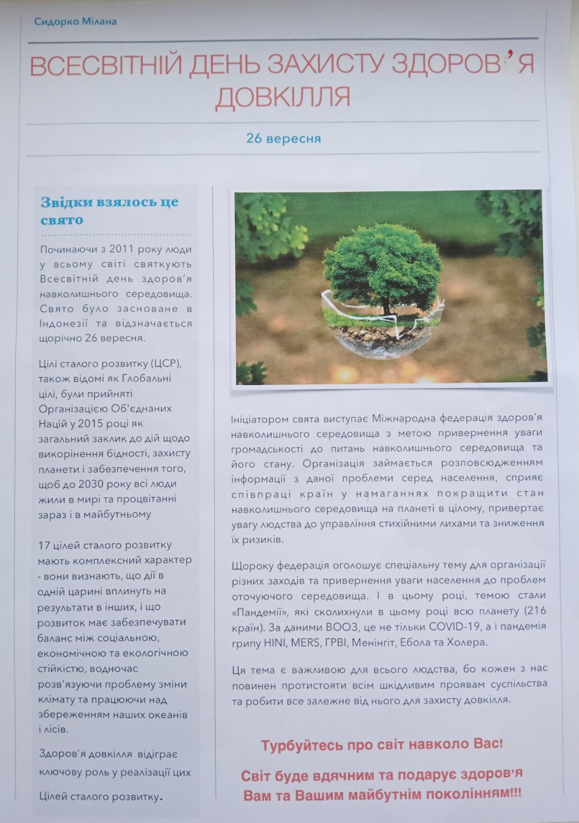 26 вересня - учні та вчителі Романо-германської гімназії №123 приєдналися до Всесвітнього дня здоров'я довкілля. Започаткували в Індонезії 2011 року.